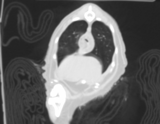 レントゲン検査にて肺または食道の異常が疑われたため、無麻酔でCT検査を実施。(本症例はおとなしい性格のため実施可能であった)